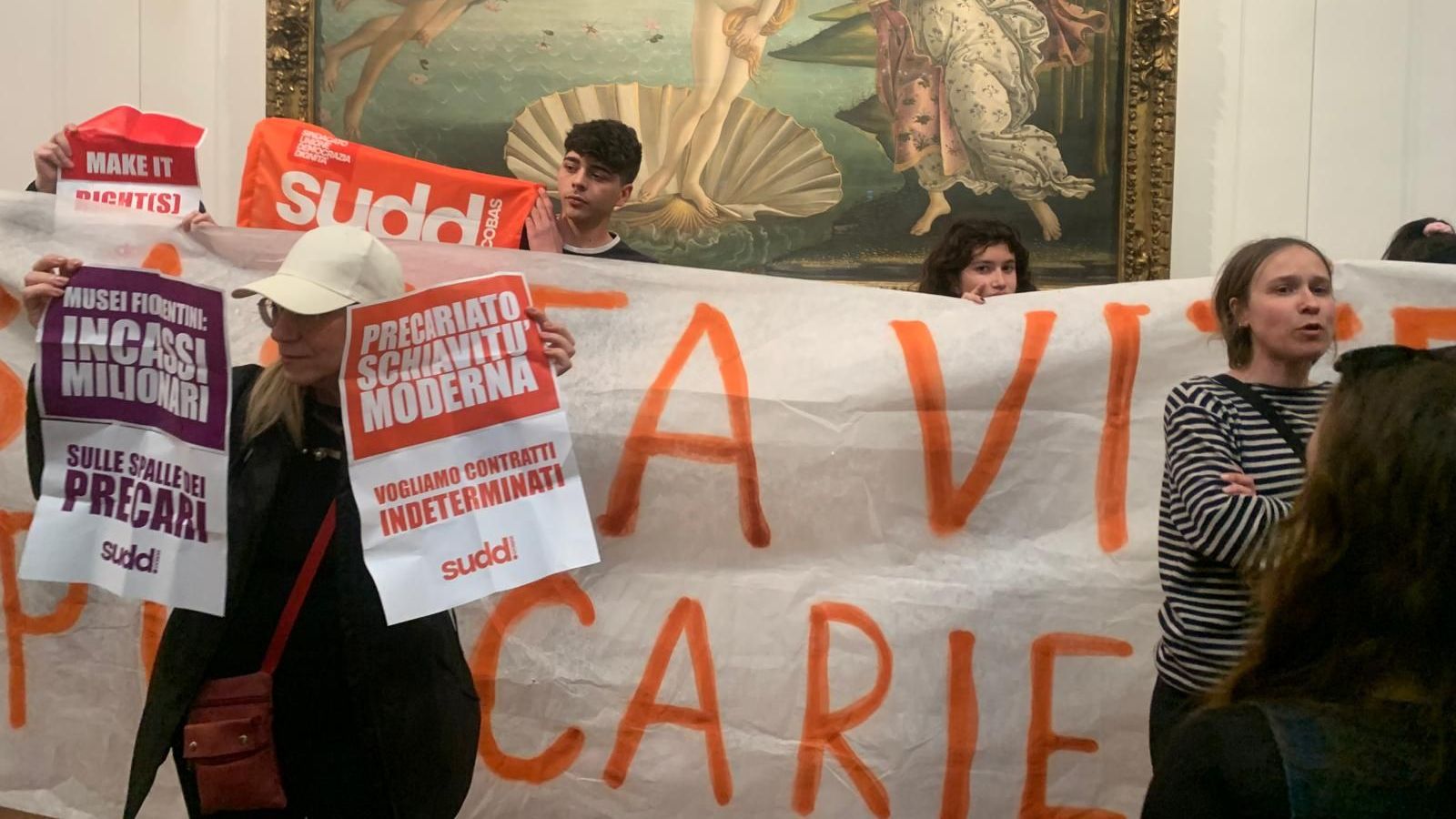 "Abbiamo portato la protesta davanti alla Venere di Botticelli per pretendere risposte urgenti per coloro che dopo anni di precarietà di ritrovano senza lavoro e salario. C'è bisogno urgentemente di stabilizzare I precari storici, e non di assumere nuovo personale con contratti a chiamata ancora più precari", fa sapere il sindacato Sudd Cobas, in mobilitazione da giorni davanti al museo.