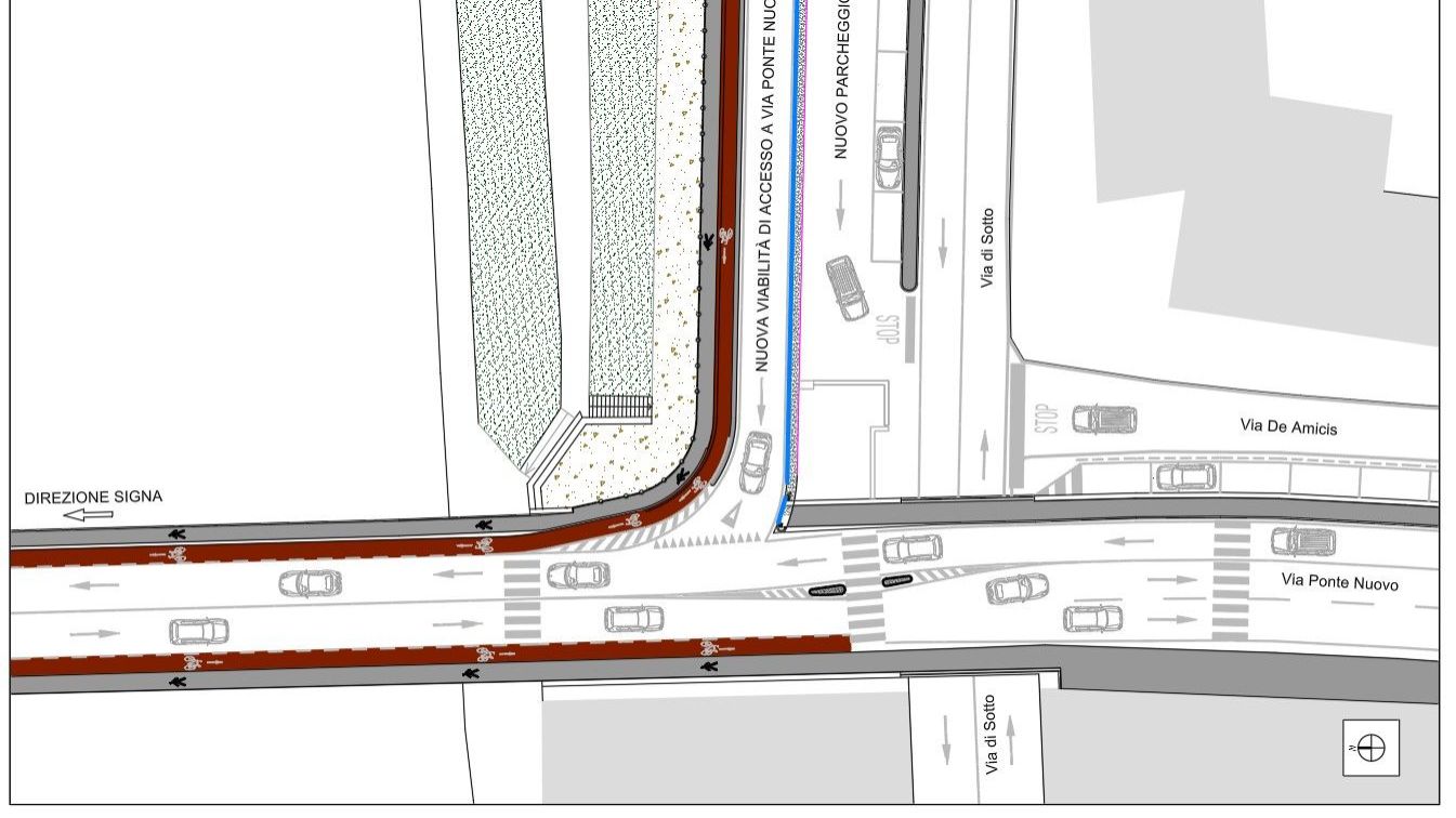 Prevista anche un’isola spartitraffico, con la funzione di smistare i veicoli e facilitare l’attraversamento pedonale. La rampa di collegamento tra via di Sotto e via Ponte Nuovo sarà percorribile da auto, biciclette e pedoni.