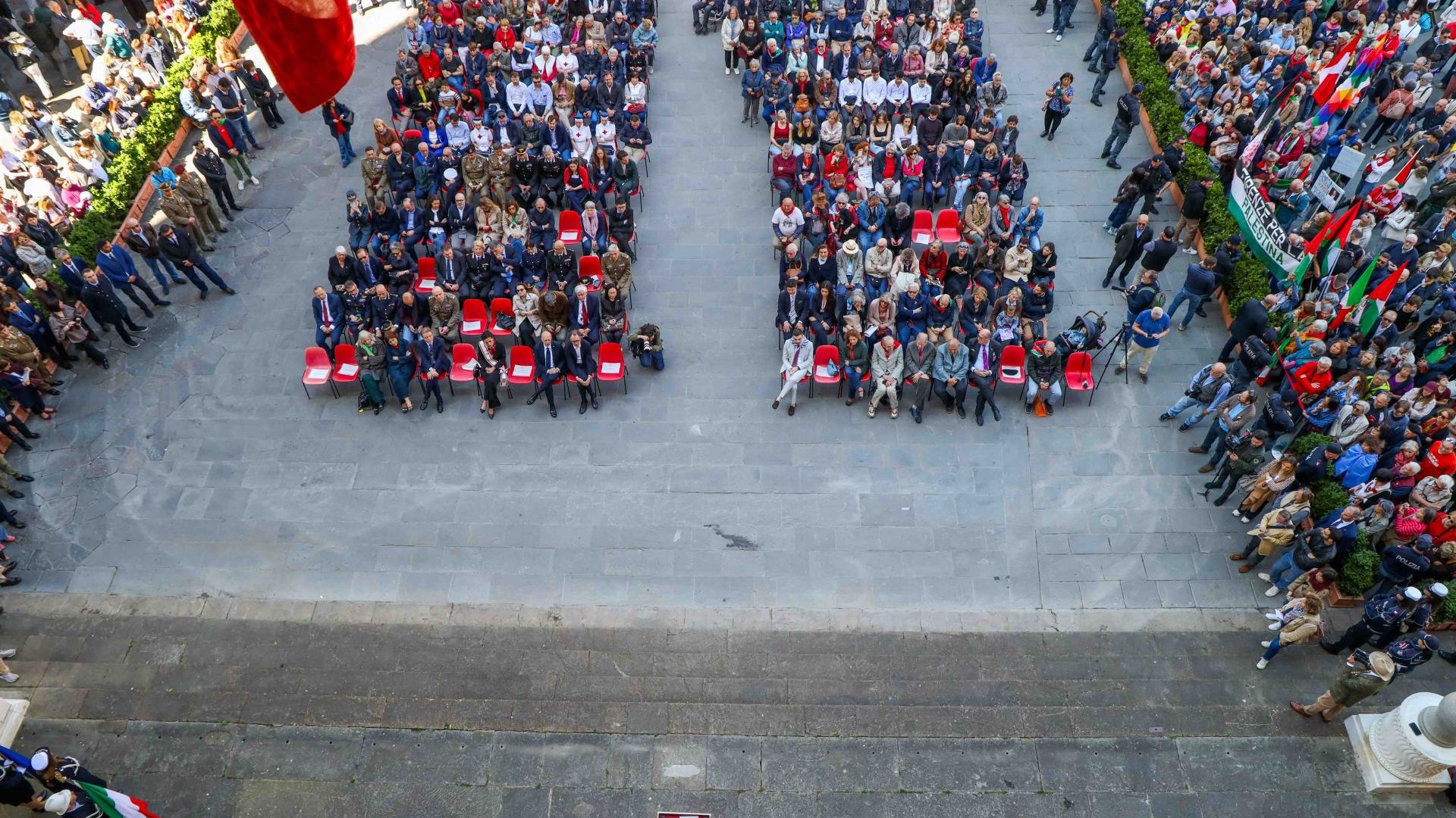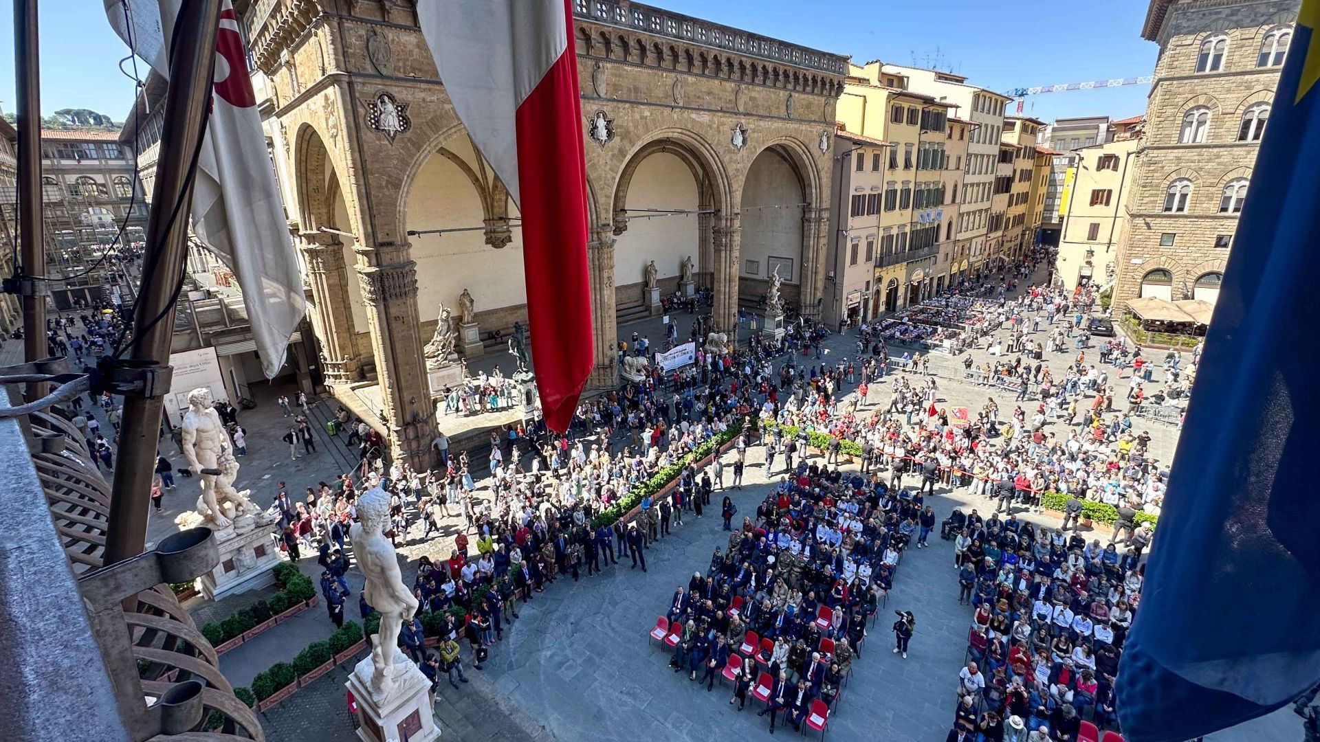 In una piazza Signoria transennata, con alcuni momenti di tensione e di ritardo nell'inizio della celebrazione, a causa delle limitazioni per l'ingresso nell'area della cerimonia, con il pubblico tenuto più a distanza dall'arengario.