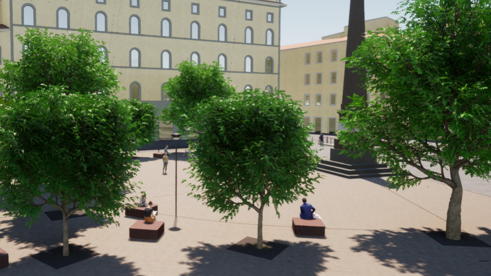 Il verde è il cuore del progetto: saranno piantati 13 nuovi alberi (3 Cinnamomum Camphora, 2 Paulownia Tomentosa, 7 Prunus Subhirtella nella piazza e un ulteriore Prunus Subhirtella sul marciapiede all’angolo con via del Melarancio) scelti per garantire ombra, varietà delle fioriture stagionali e resistenza al contesto urbano. A questi si aggiungono anche i tre alberi già piantati nello stralcio fronte Hotel W già realizzato dai privati. Le chiome copriranno circa il 60% dell’area verde, creando zone ombreggiate in una delle piazze che oggi è uno dei punti termicamente più critici della città.