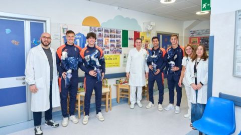 Uova di Pasqua per i pazienti della Pediatria, la visita dei vigili del fuoco e dei giocatori dell'Empoli empoli